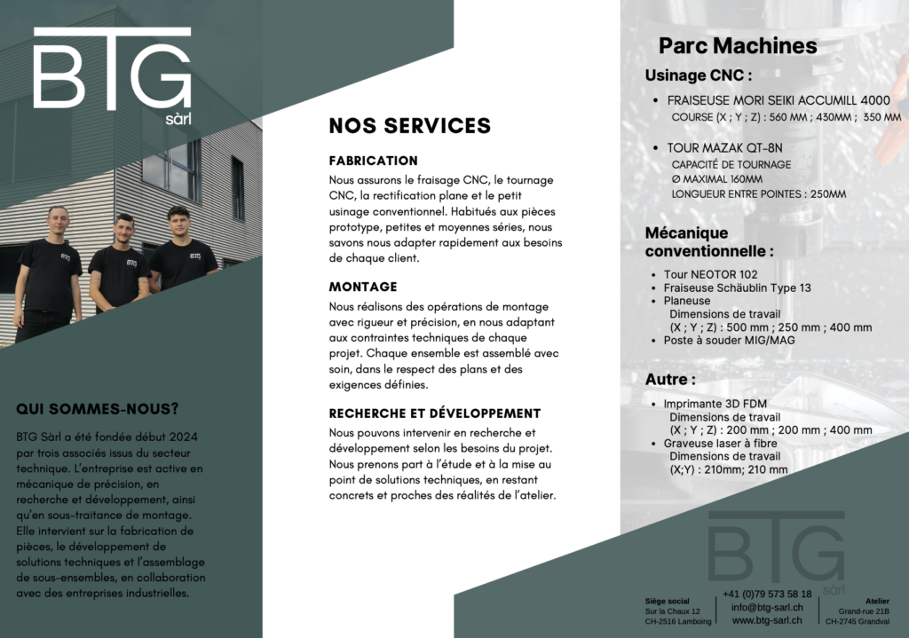 BTG Sàrl a été fondée début 2024 par trois associés issus du secteur technique. L’entreprise est active en mécanique de précision, en recherche et développement, ainsi qu’en sous-traitance de montage.
